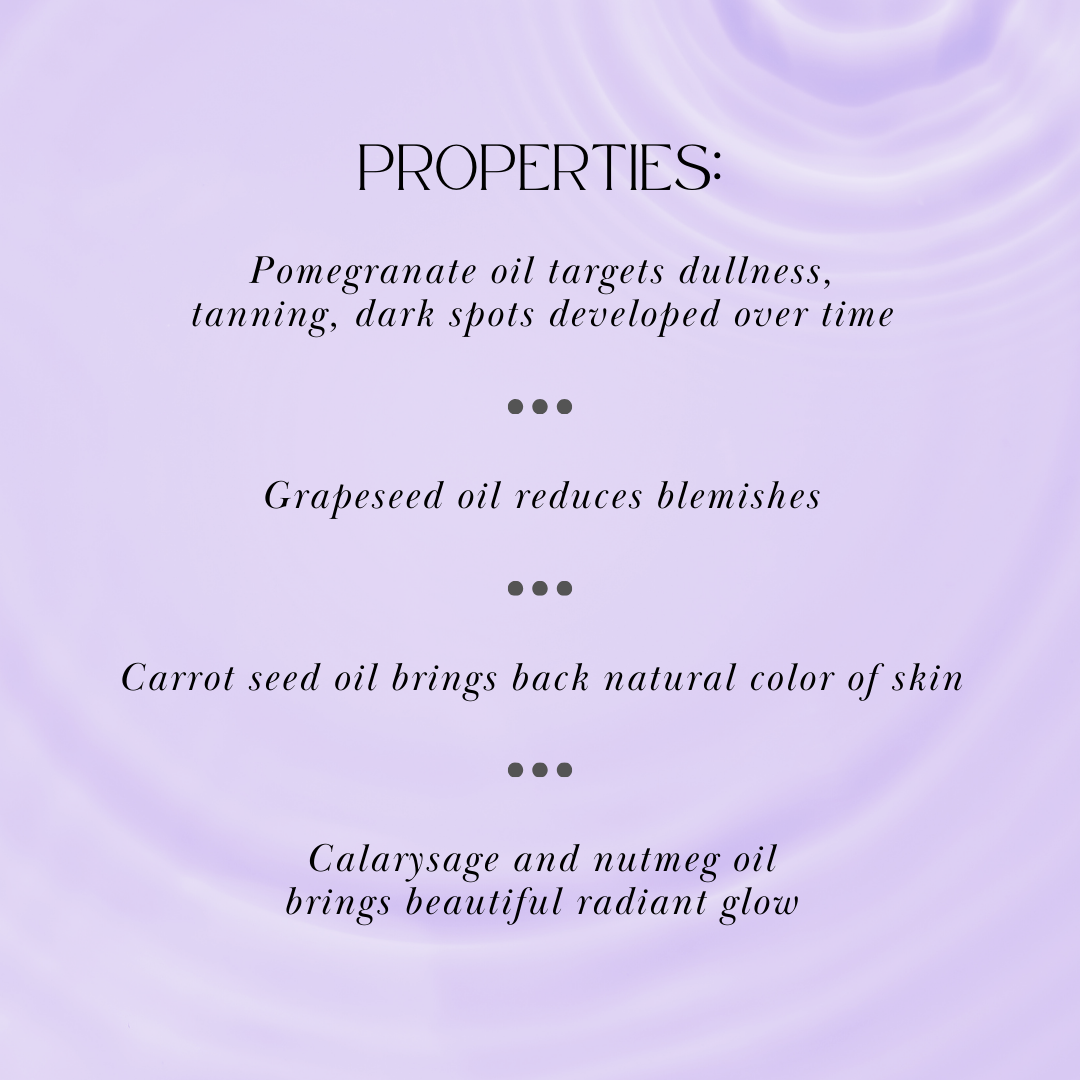 Pomegranate oil targets dullness, tanning, dark spots developed over time.